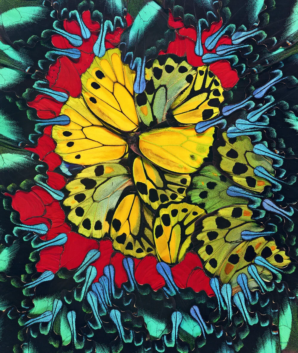 All of Nathalia Edenmont’s work derives from her life experience. She says: “I only look inside my head. What I see in my mind is what I create. I do not sketch; the image is complete and sharp within me. I have absolute control over all aspects of what I do.” Using a large format Sinar camera with 8x10 film and many lenses, she composes each shot. She is known for her images of women wearing dresses composed of fruits and flowers, and most recently dresses of golden, green, iridescent pink, blue, shiny, shimmery beetles. In addition to her portraits, Edenmont creates butterfly collages, the fruits of over 500 hours of work each. The collages become “maquettes” for her monumental scale photographs. The large-scale photographs, brilliant in color, are what the artist considers her abstract paintings.