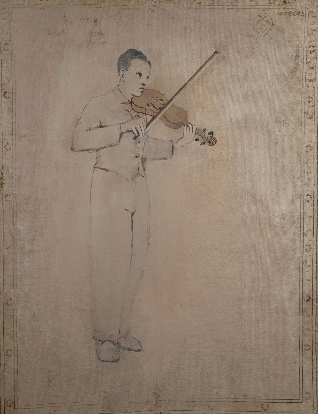 Africano first gained prominence in the 1970s through his association with the transitional movement represented in the Whitney Museum exhibition New Image Painting. His signature large monochrome canvases featured small figures in relief accompanied by fragments of text, creating a theatrical and stylized narrative within an atmosphere of spare, enigmatic simplicity.