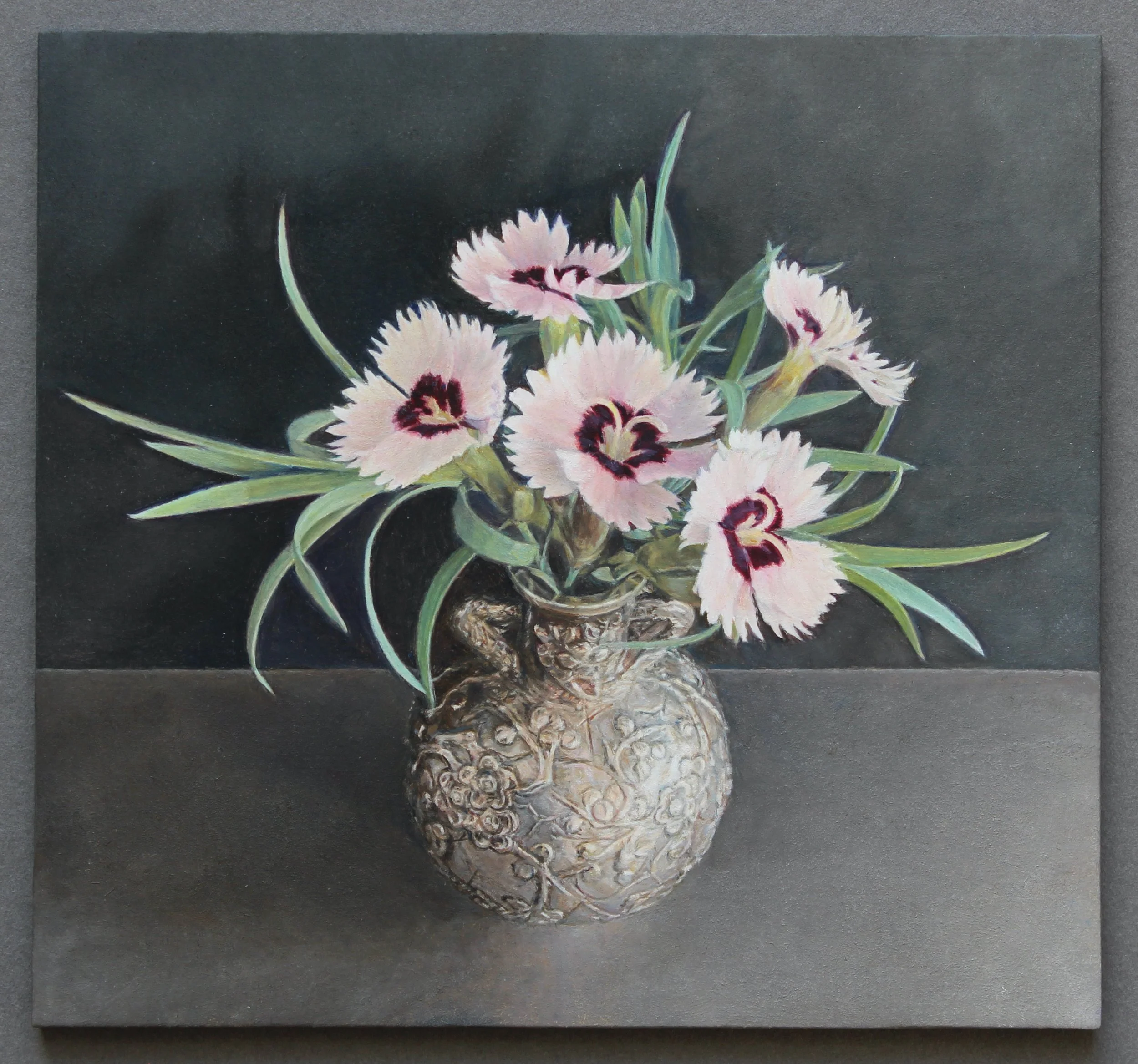 Lucy Mackenzie identified her scale while at the Royal Academy in London and has stayed with it over the years. Her 2 x 3 inch paintings range to 4 x 7 inches in oil. There is no photoshop or digital impact, the works are painted in thin layers in oil. Each of the artist’s still life--her signature subject-- pieces, while tiny in scale, is an invitation to a pure, uncluttered world. Her subjects are the "stuff" of an ordinary life: balls of twine, a wrinkled dishcloth, forks in a glass; she makes the ordinary EXTRA-ordinary.